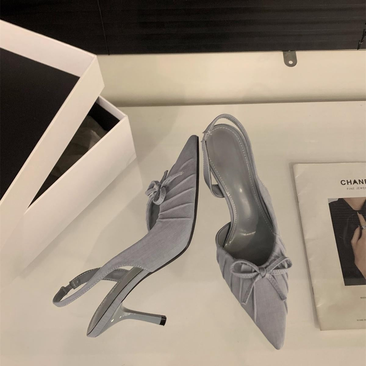 French Gentle•White Pleated Bow High Heels for Women Spring Backless Shallow Mouth