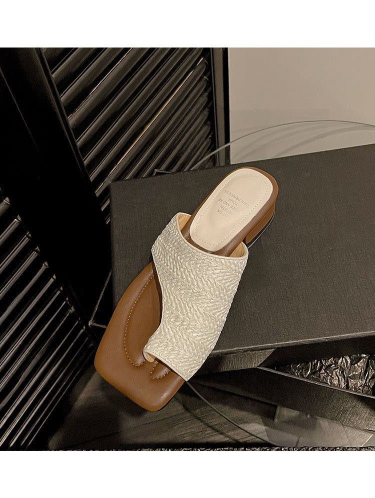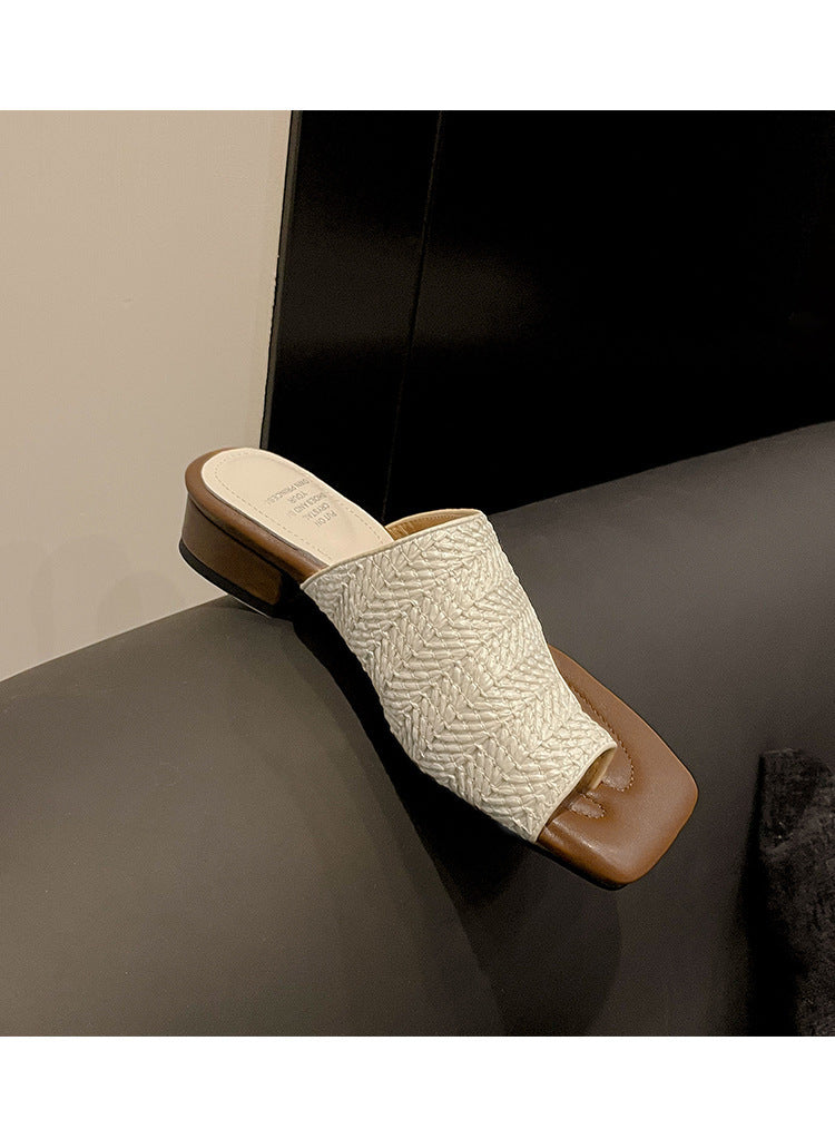 French Retro Vacation Style Woven Toe Clip Sandals for Women Summer Niche Design Chunky Heel Sandals