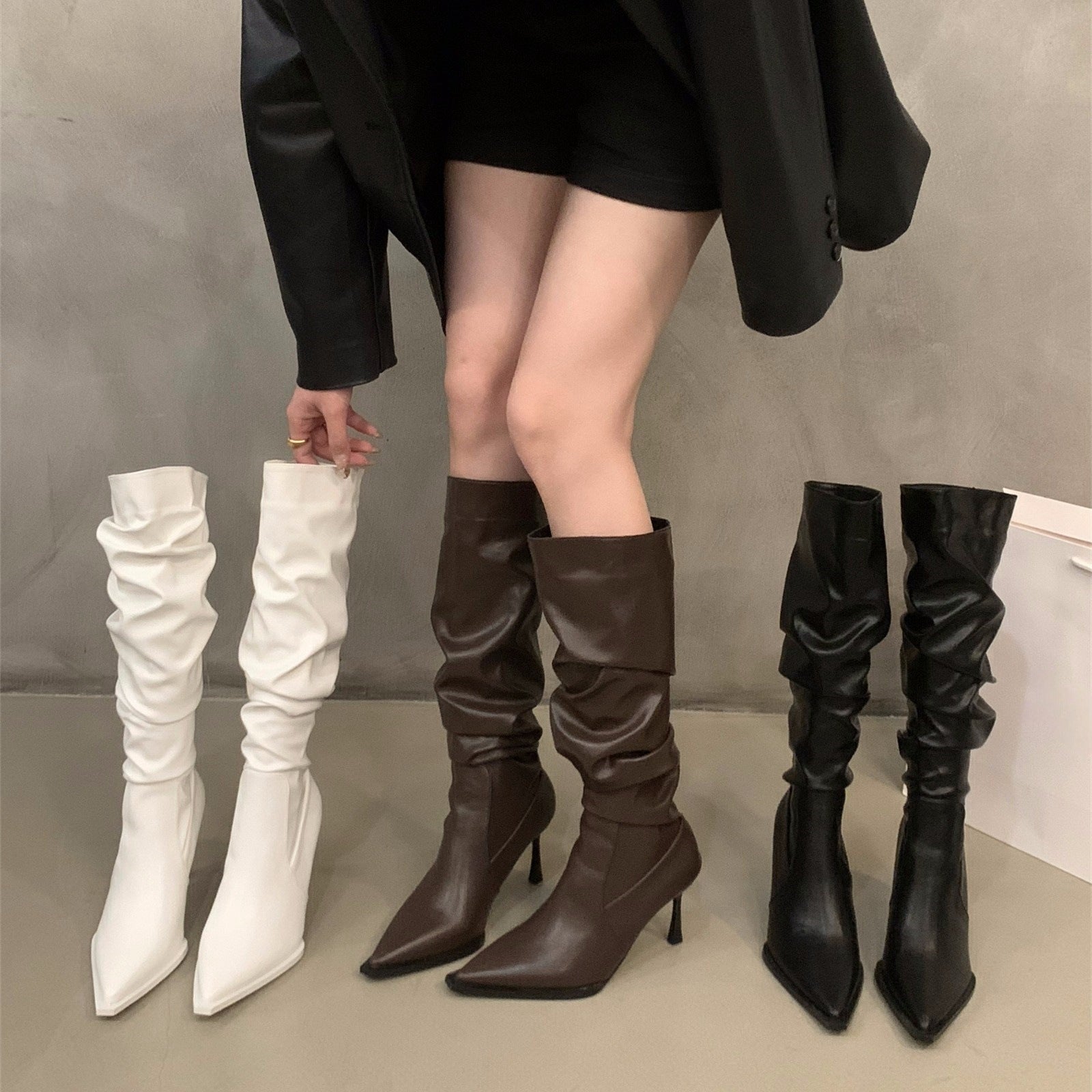 High Heel Pointed Toe Pile Long Boots Women's Shoes2024New Autumn and Winter White Slim Thin Heel Knight Mid-Length Boots