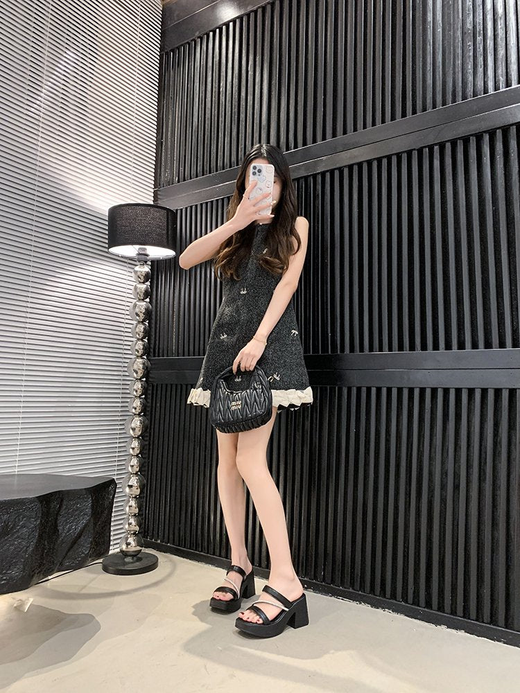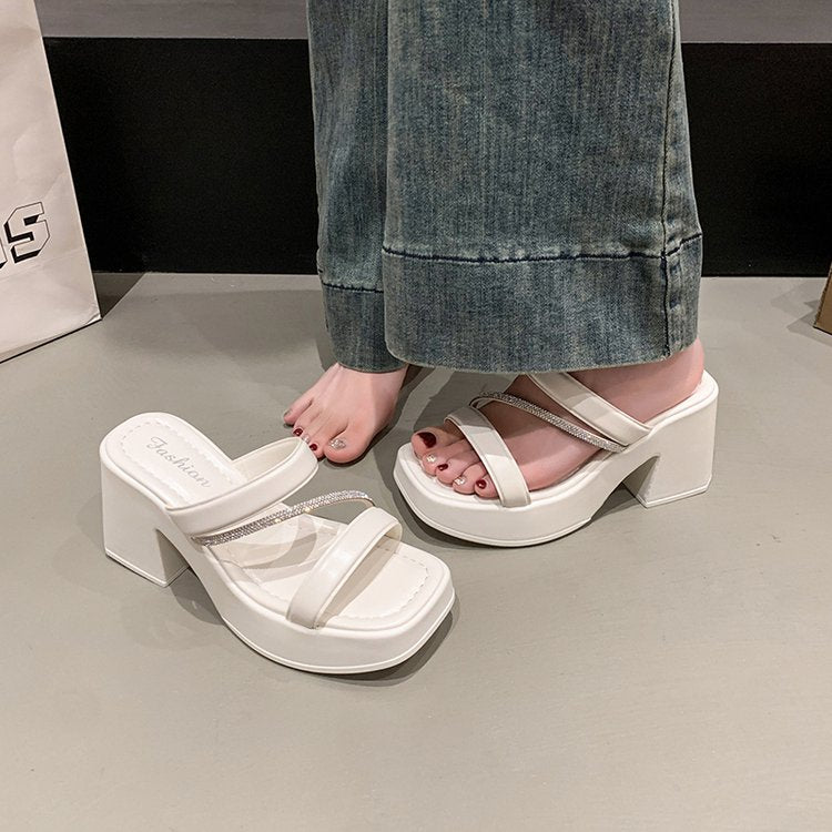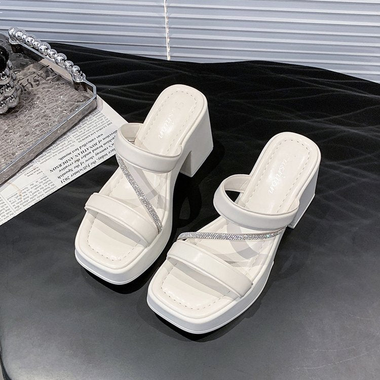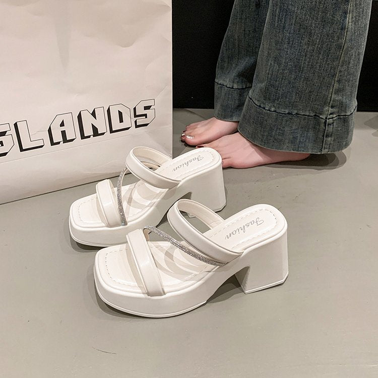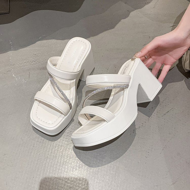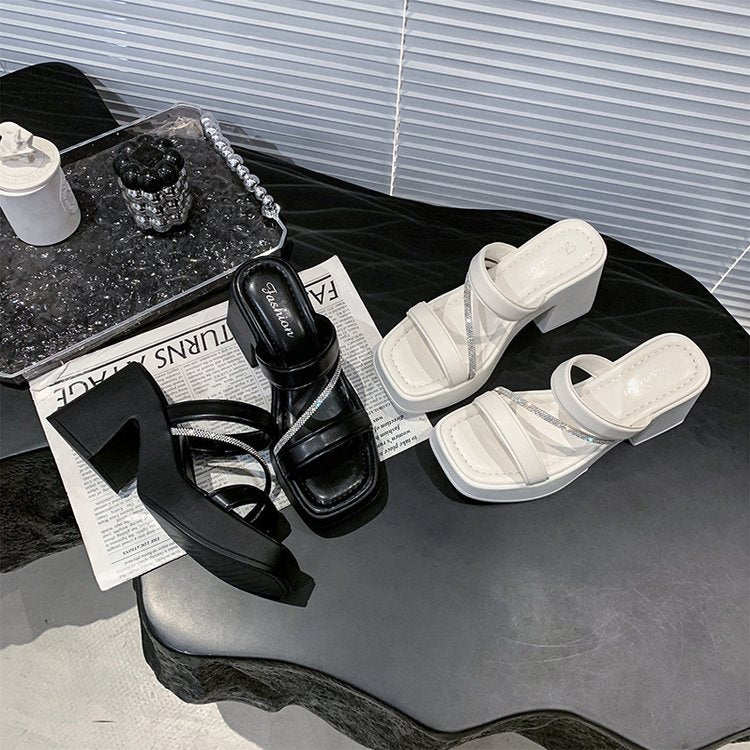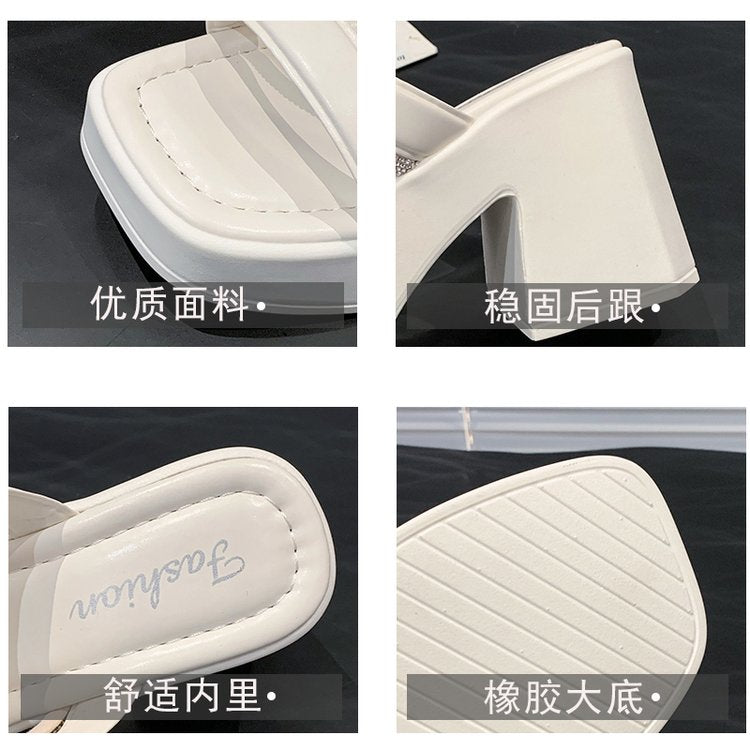 Solid Color Rubber Chunky Heel PU High Heel Slippers