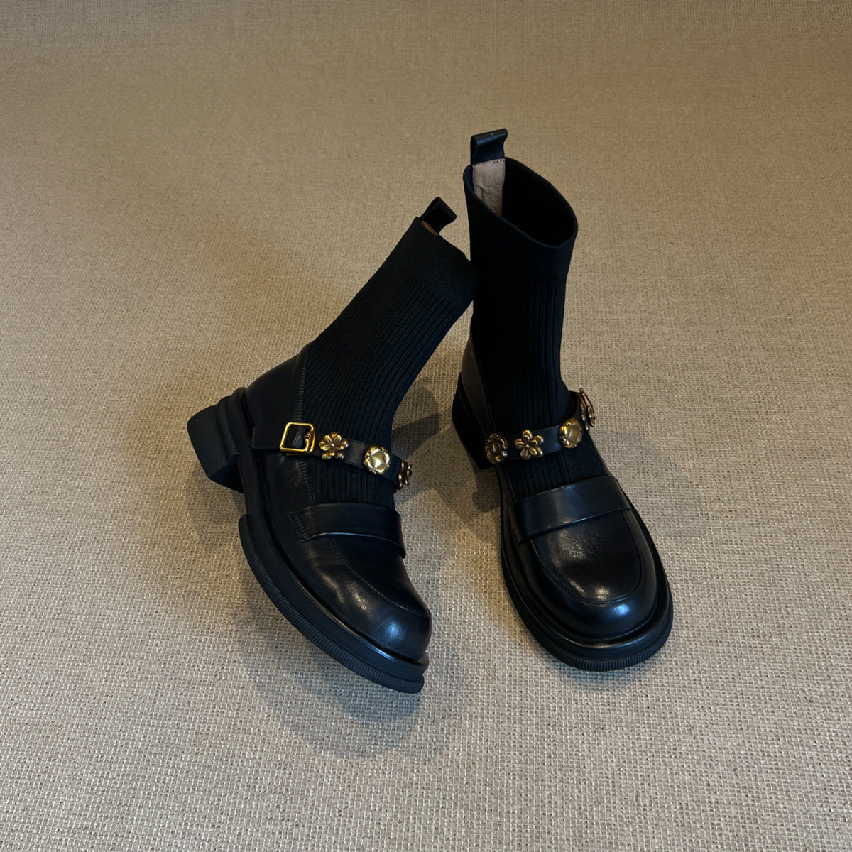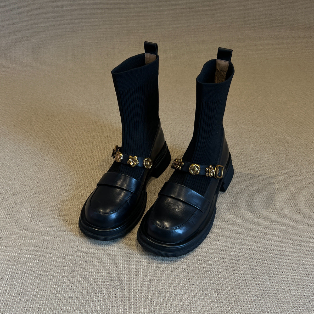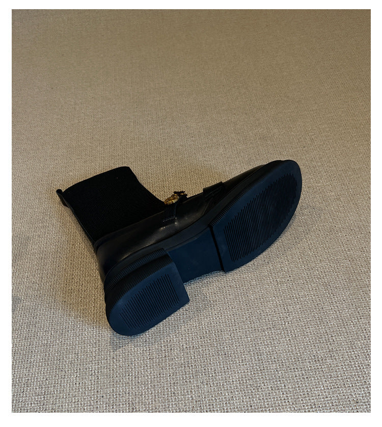 Thick-Soled Metal Buckle Elastic Short Boots Retro College Style Knitted Slim Boots Women Versatile Loafers Sock Boots